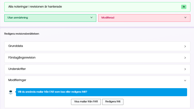 Statusen “med modifiering” i kontrollen är en intern markering som visar att revisionsberättelsen har redigerats från standardmallen. Den följer inte med i arkiveringen eller i den inlämnade revisionsberättelsen, utan fungerar som ett stöd för dig som revisor.