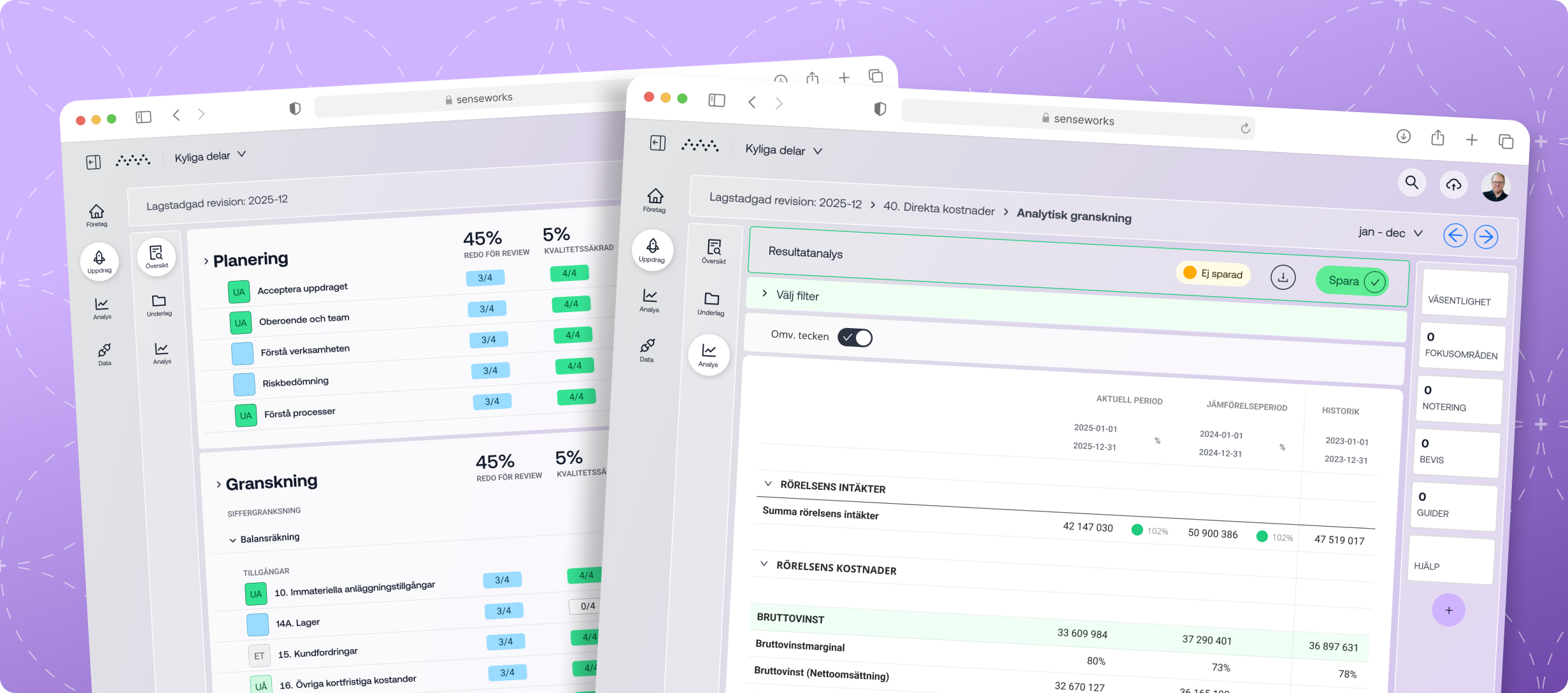 Resultatet är ett sömlöst arbetsflöde där revision och analys hänger ihop på ett naturligt sätt. Du behåller fokus, slipper onödig navigering och kan arbeta effektivt och strukturerat med full spårbarhet genom hela revisionsprocessen.