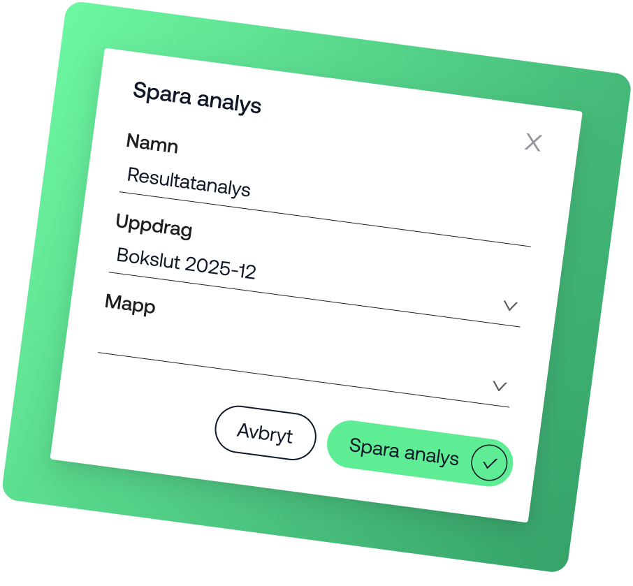 Inom ett uppdrag kan du samla fria analyser, analyspaket och andra underlag som hör ihop. Det gör det möjligt att samla alla analyser för året i ett och samma uppdrag, vilket ger en tydlig helhetsbild samtidigt som allt hålls samlat på ett logiskt och överskådligt sätt. Varje uppdrag är kopplat till ett räkenskapsår. Det innebär att perioden följer uppdraget automatiskt. Du slipper uppdatera periodfilter manuellt eller riskera att arbeta i fel år och kan istället fokusera på analysen.